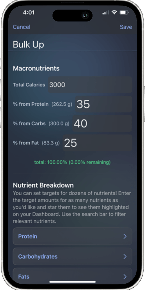 Create Goal Profiles: Bulking, trimming, or following Doctor's orders? Name your goal and set your unique Macro and Micronutrient targets.