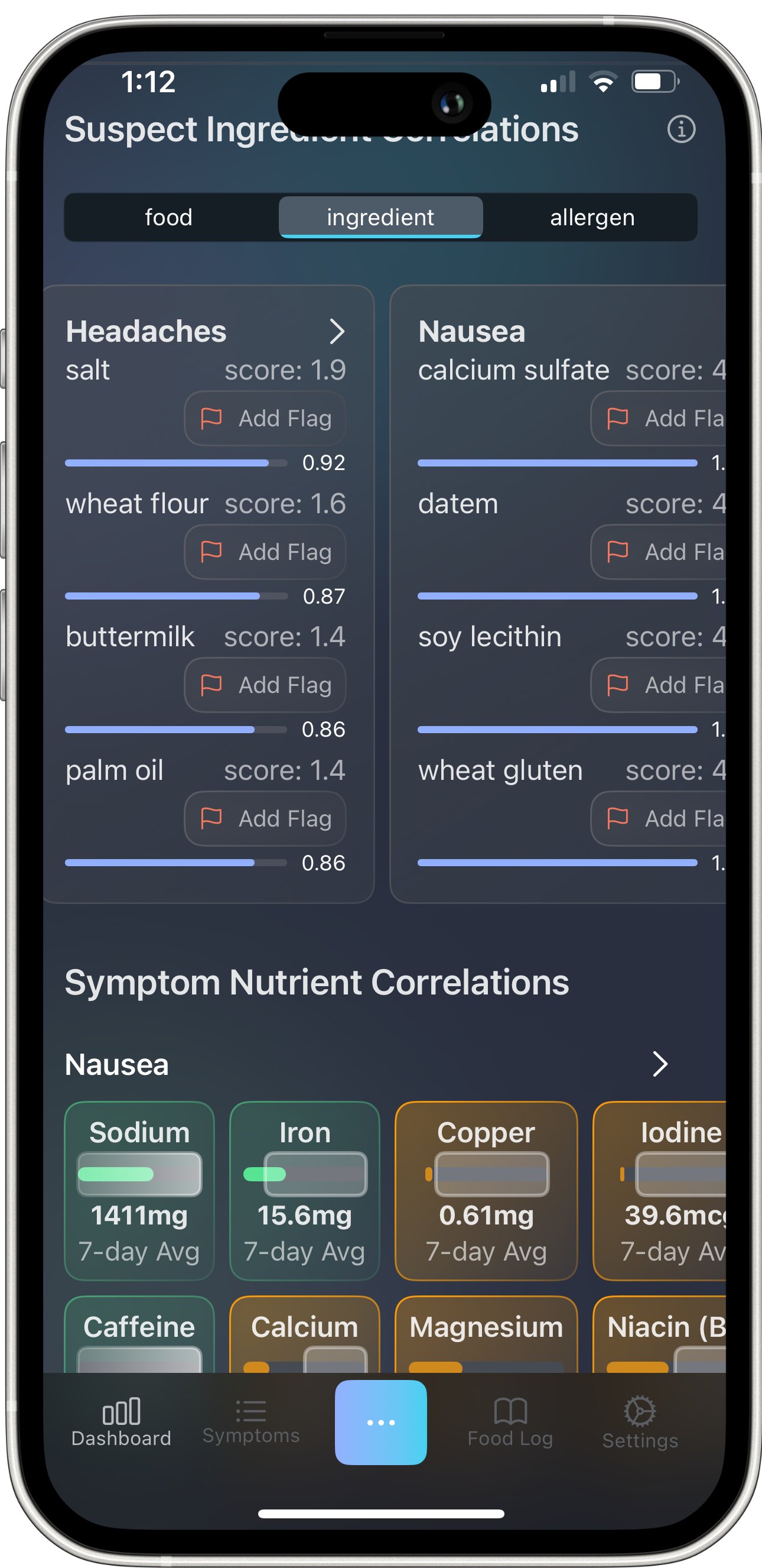 Discover which foods, ingredients, or allergens might be causing your symptoms using TCT's correlation analysis. Learn how to read scores, flag suspects, and customize your analysis.