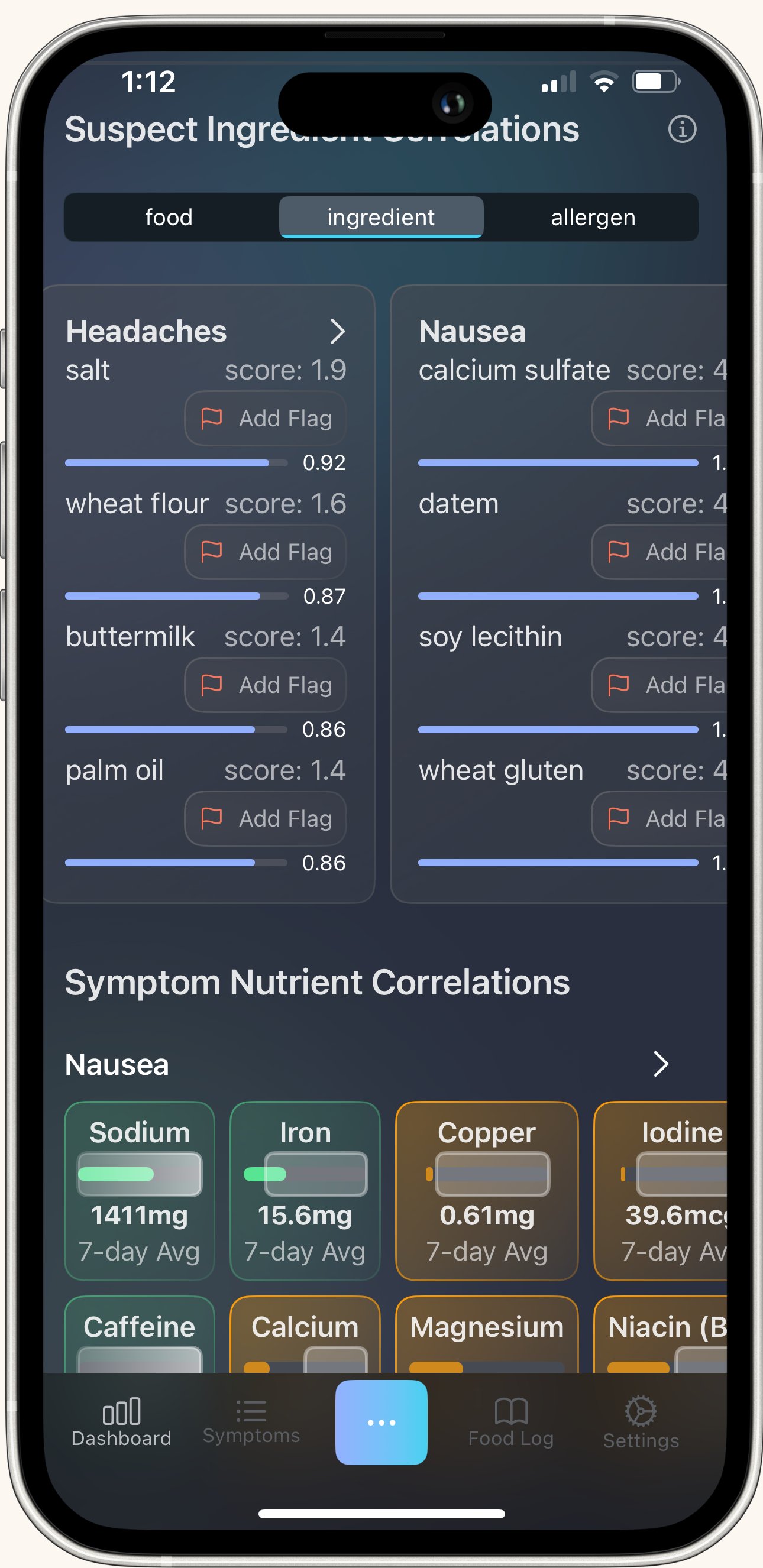 Bottom Line: Flagging puts you in control. Set up alerts for known allergens and sensitivities before you start, then add newly discovered triggers as TCT uncovers them. The Dashboard's 3-week view shows whether you're successfully avoiding flagged items and if that avoidance is improving your symptoms. It's your real-time feedback loop for taking action on triggers.
